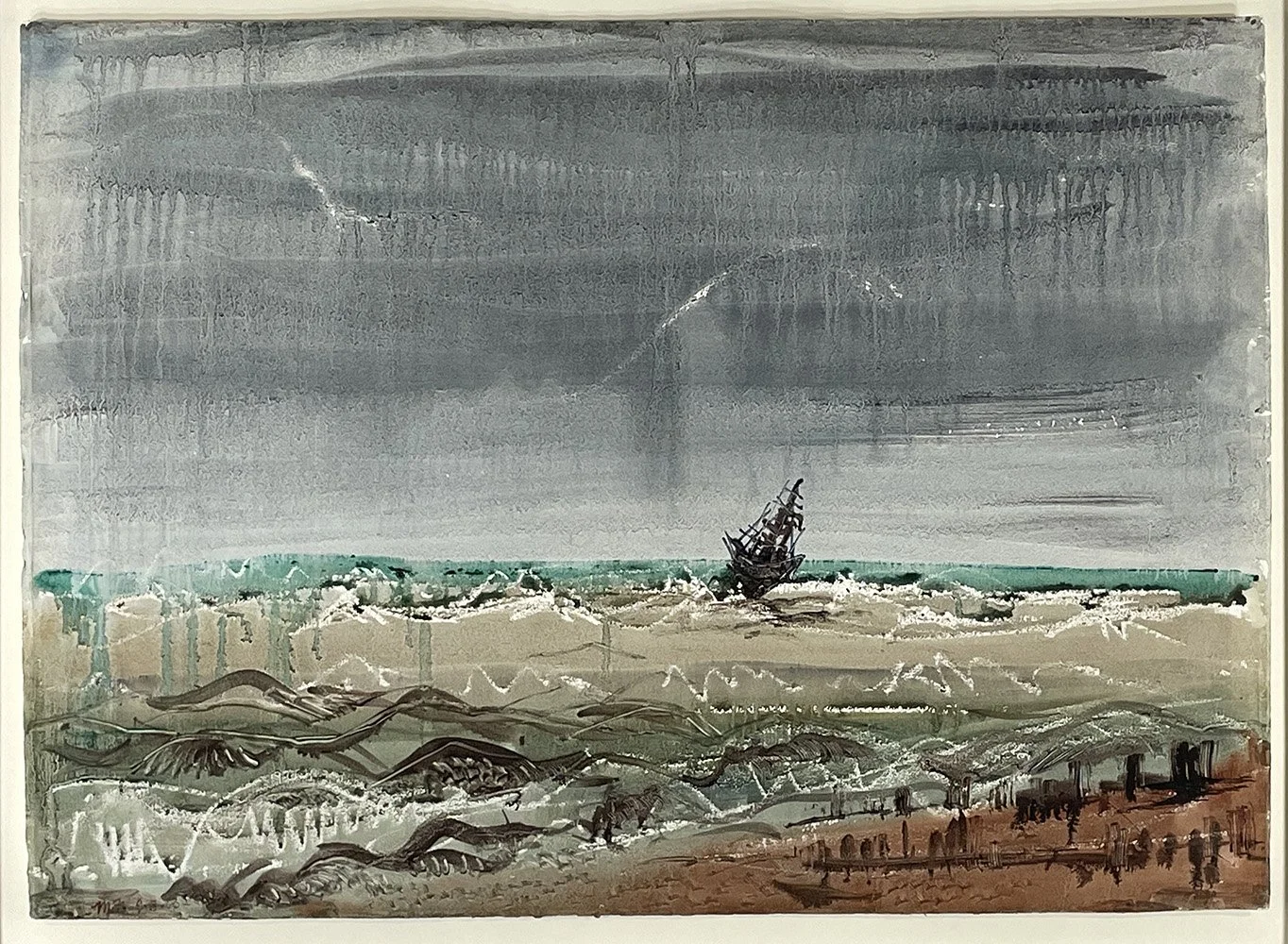 Mary Filer put Greek mythology to copper, creating etchings of nymphs and satyrs during 1952 and 1953. In England she turned her skills again to painting. “Winter Sea, Sandgate, Kent”, a watercolour and wax relief mixed media piece of the misty, grey winter of the coast of England.